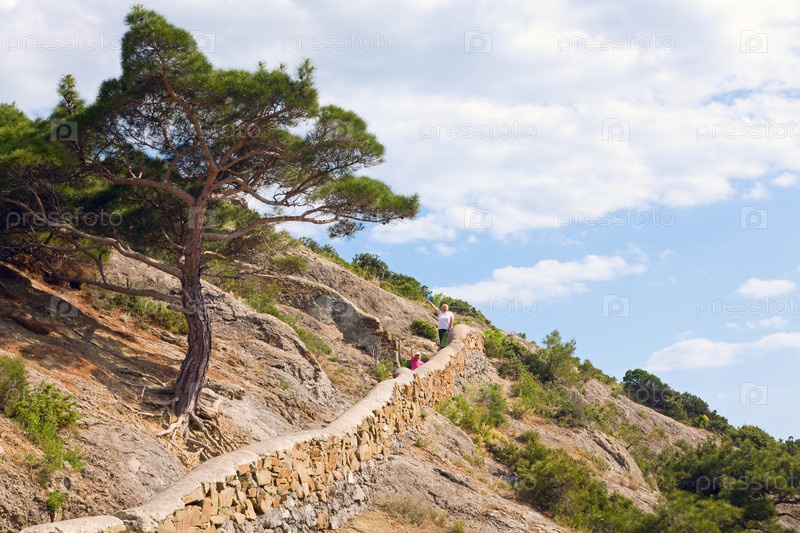 Горный можжевельник и Тропа Голицына в заповеднике Новый Свет на фоне облачного неба