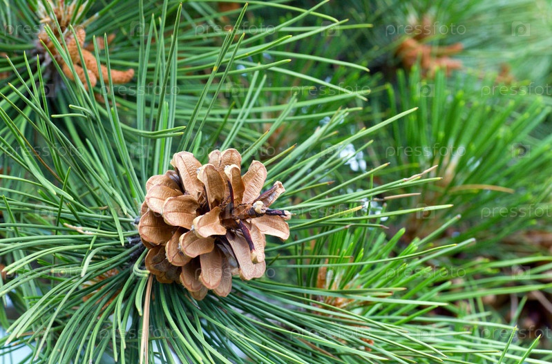 Коричневая шишка на зеленой ветке сосны