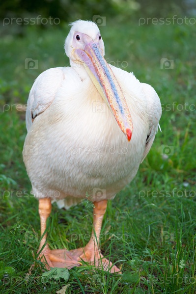 Белый пеликан на зеленой лужайке