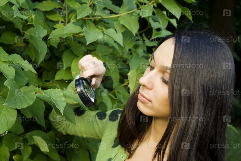 Девушка разглядывает растение под лупой