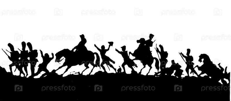 Силуэты людей и лошадей на поле боя на белом фоне