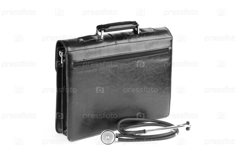 Черный кожаный портфель и черный стетоскоп на белом фоне