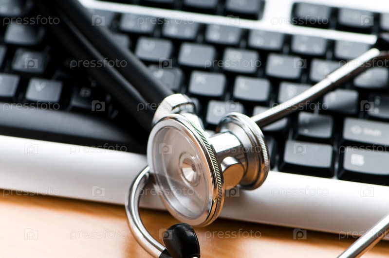 Черный стетоскоп лежит на клавиатуре на деревянном столе