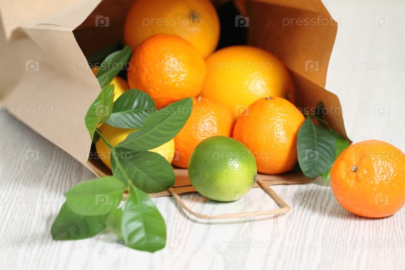 Свежие цитрусовые фрукты в пакете на деревянном столе