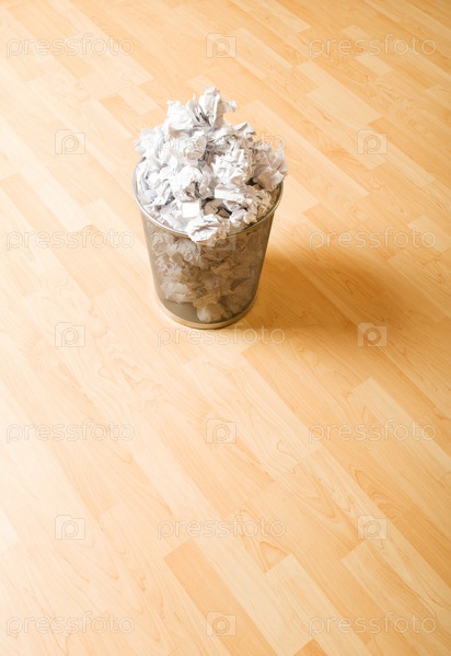 Переполненная мусорная корзина с макулатурой на паркетном полу