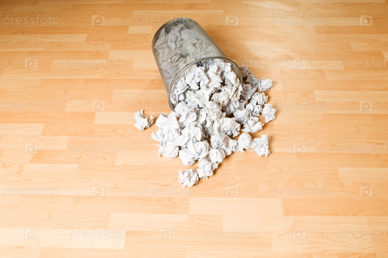 Макулатура высыпалась из опрокинутой мусорной корзины на пол