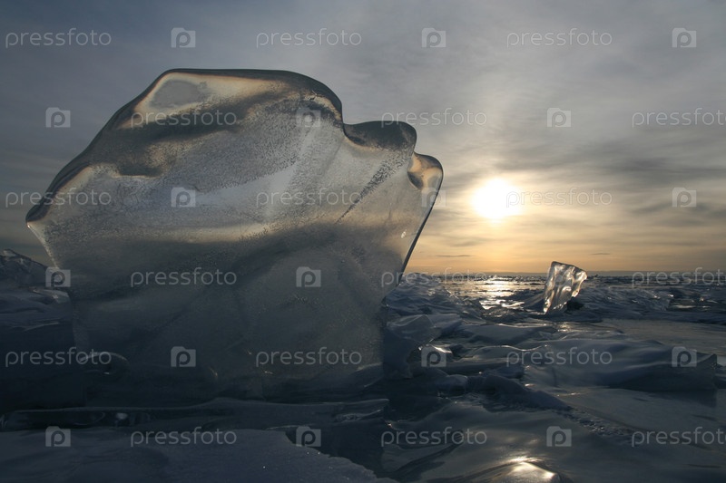 Прозрачная глыба из льда на замерзшей ледяной поверхности