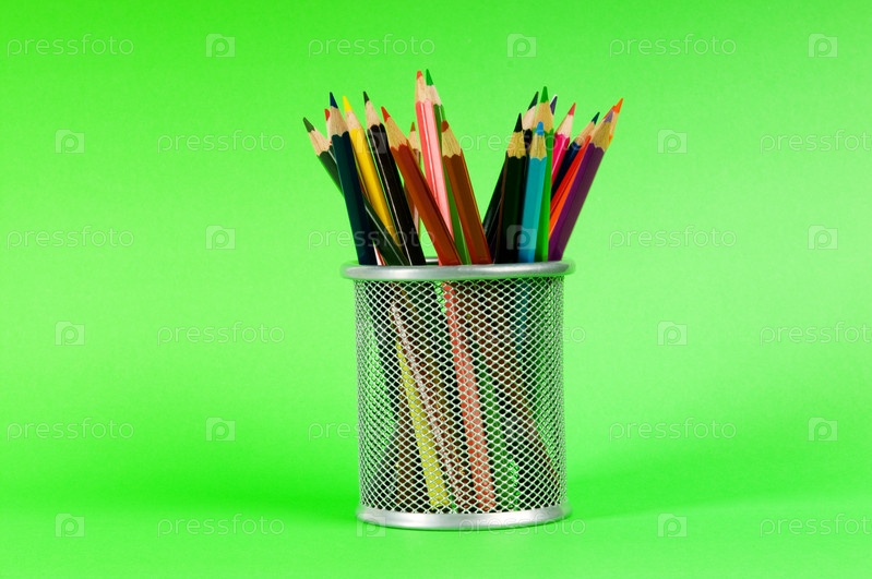 Цветные карандаши в прозрачном стакане на зеленом фоне