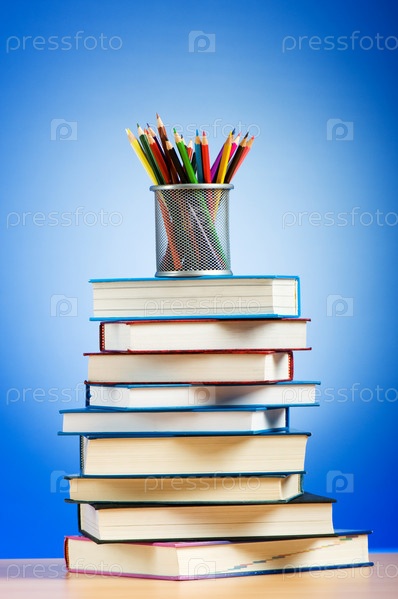 Стакан с цветными карандашами стоит на стопке книг на синем фоне