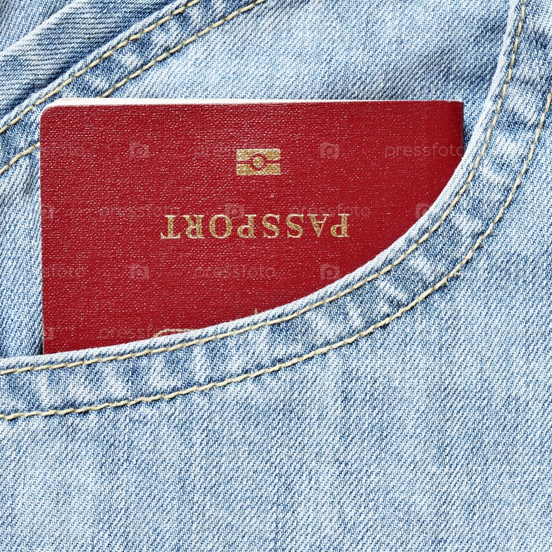 Красный биометрический паспорт в кармане джинсов крупным планом
