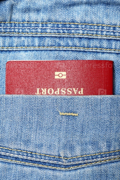 Красный биометрический паспорт в кармане джинсов крупным планом