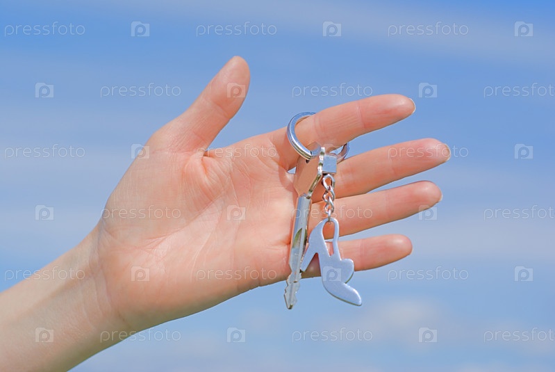 Ключи с брелоком в руке на фоне неба