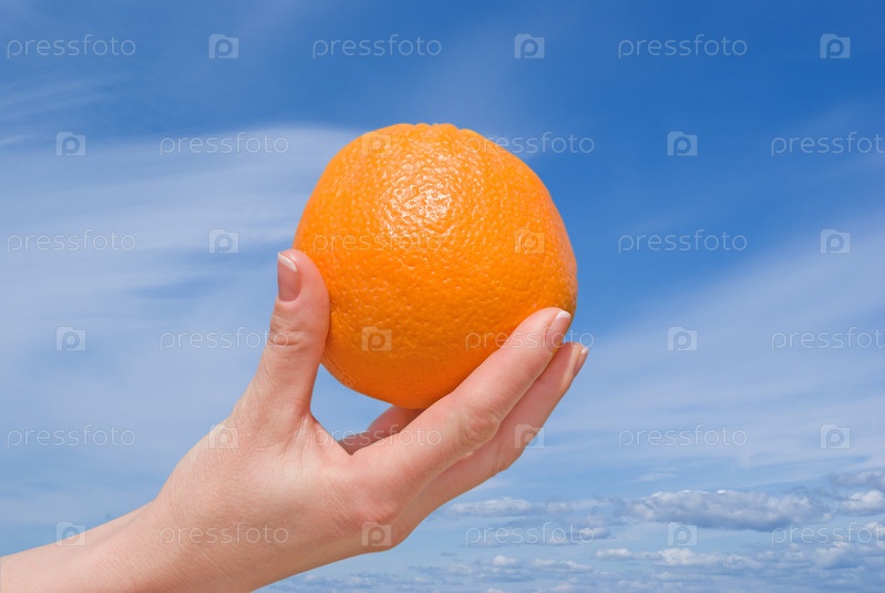Апельсин в руке на фоне неба