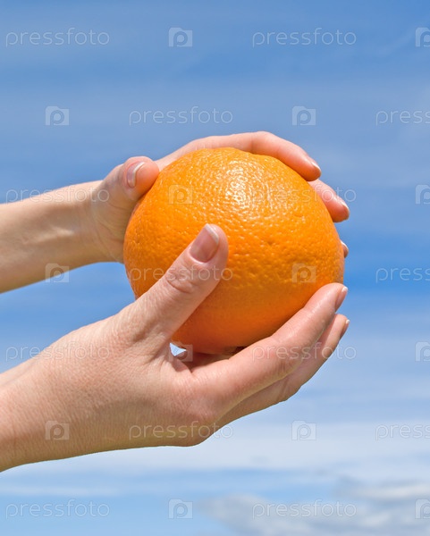 Апельсин в руках на фоне неба