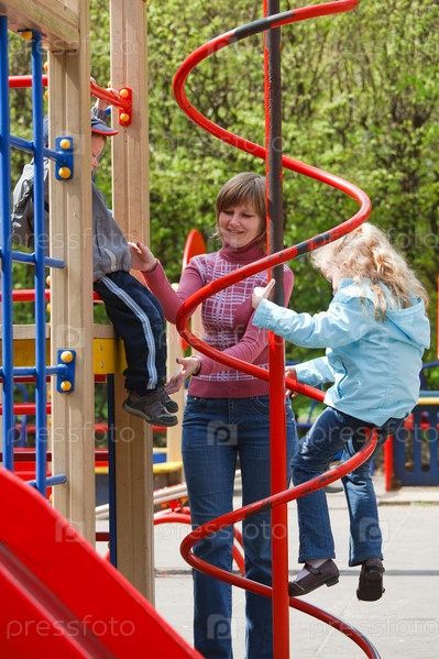 Молодая мама играет с детьми на детской площадке