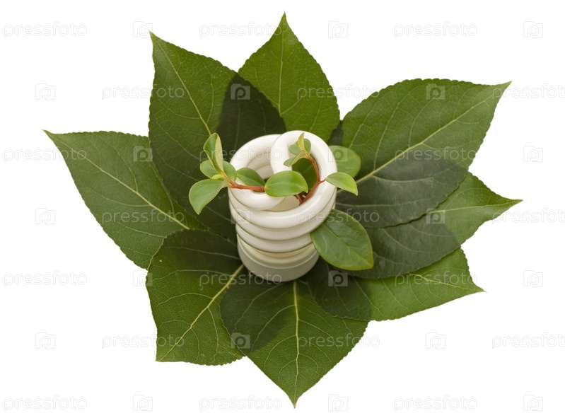 Энергосберегающая лампа с зелеными листьями крупным планом на белом фоне