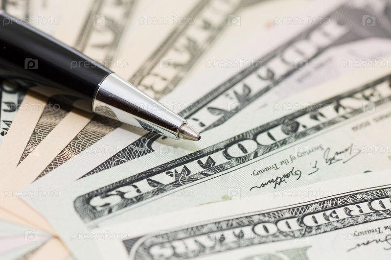 Долларовые купюры и шариковая ручка крупным планом