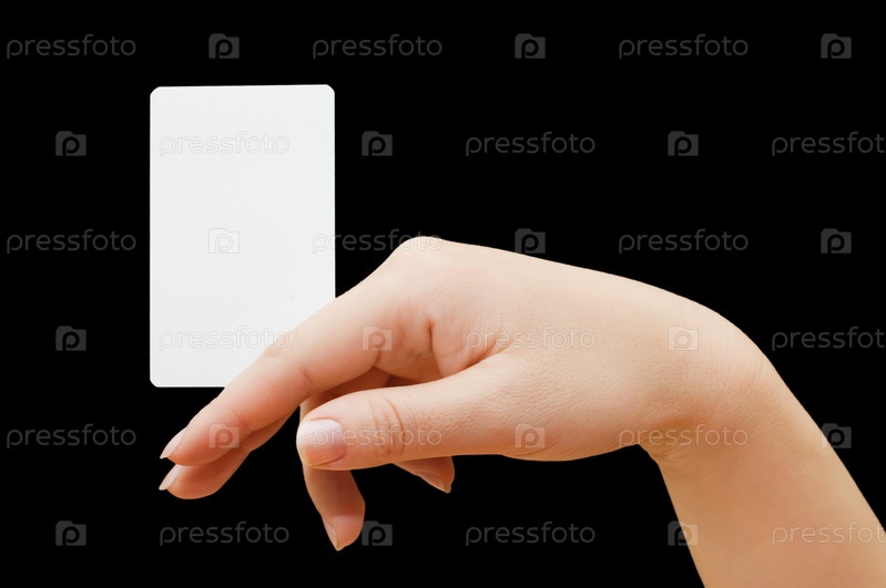 Женская рука держит визитную карточку на черном фоне
