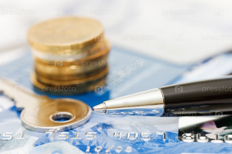 Стопка монет, ключик, ручка и кредитные карты крупным планом