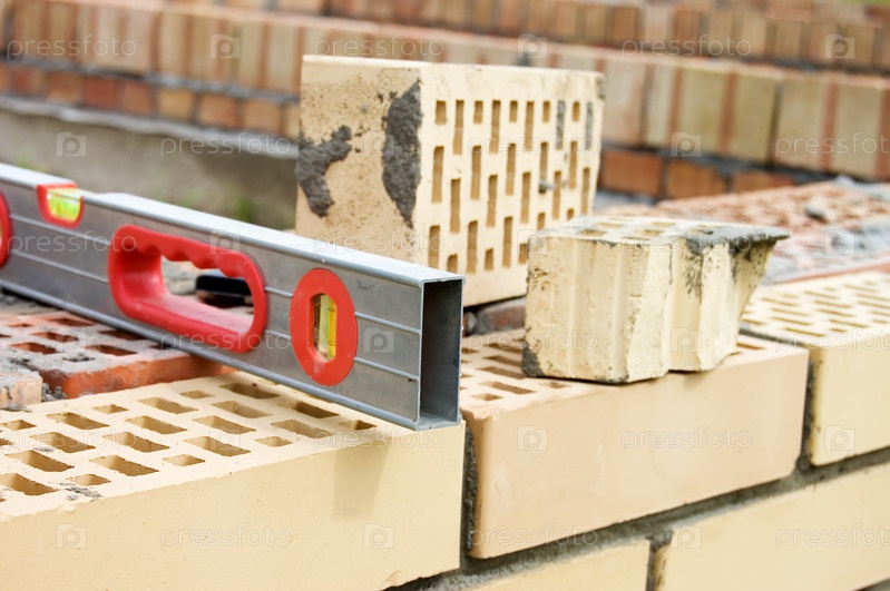 Кирпичи для строительства и уровень крупным планом