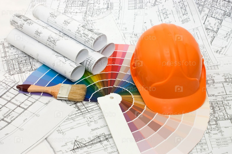 Образцы цветов, каска, кисть и строительные чертежи крупным планом