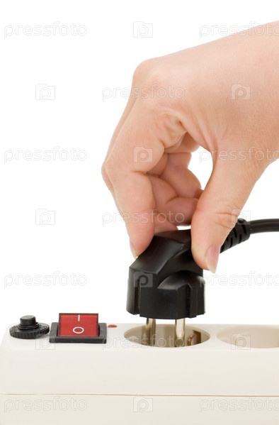 Рука втыкает вилку в тройник на белом фоне
