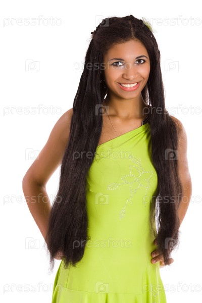 Красивая молодая женщина в ярком платье крупным планом