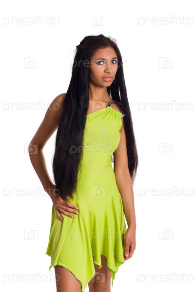 Красивая молодая женщина в ярком платье на белом фоне