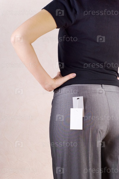 Женщина мерит серые брюки в магазине