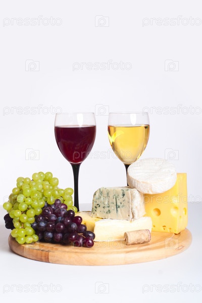 Два бокала вина, сыр и виноград