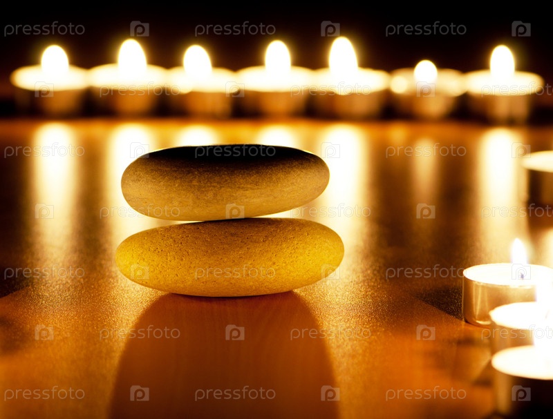 Горящие свечи и гальки для ароматерапии на деревянном полированном столе