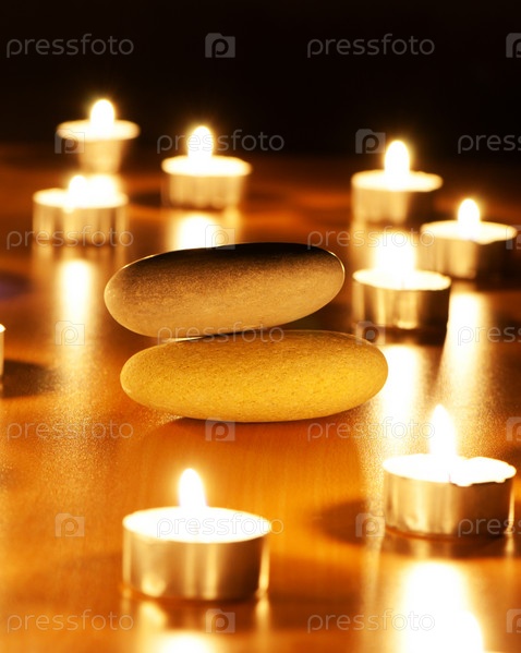 Горящие свечи и гальки для ароматерапии на деревянном полированном столе