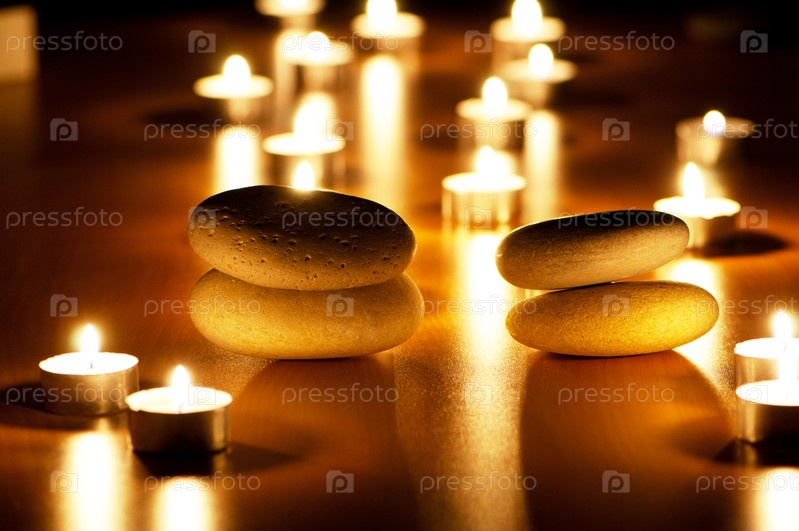Горящие свечи и гальки для ароматерапии на деревянном полированном столе
