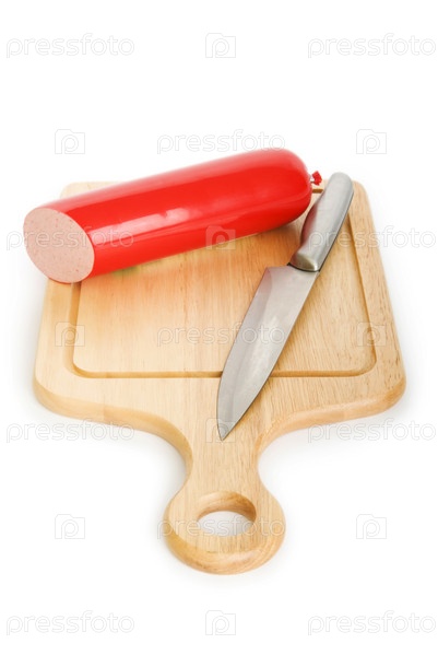 Нож и колбаса на деревянной кухонной доске на белом фоне