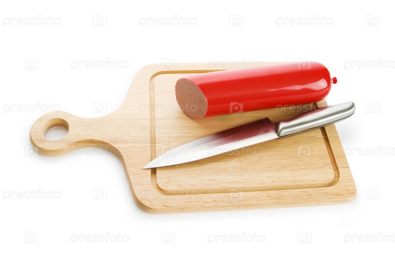Нож и колбаса на деревянной кухонной доске на белом фоне