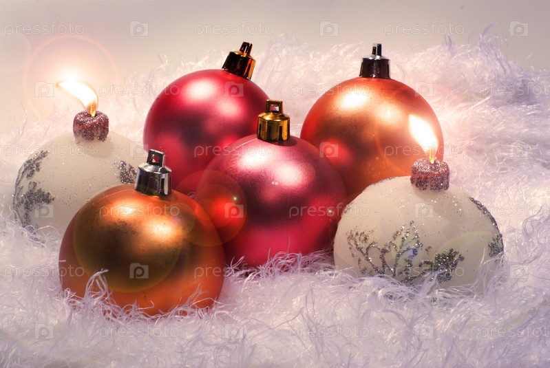 Новогодние шары и свечи на белом фоне