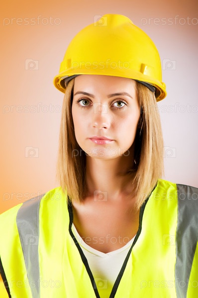 Девушка в желтой каске на коричневом фоне