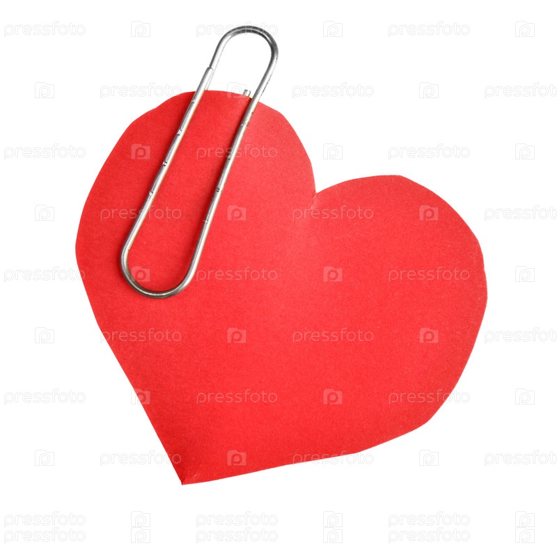 Бумажное красное сердце со скрепкой, изолированное на белом фоне