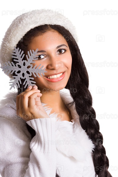 Молодая женщина держит в руке большую снежинку