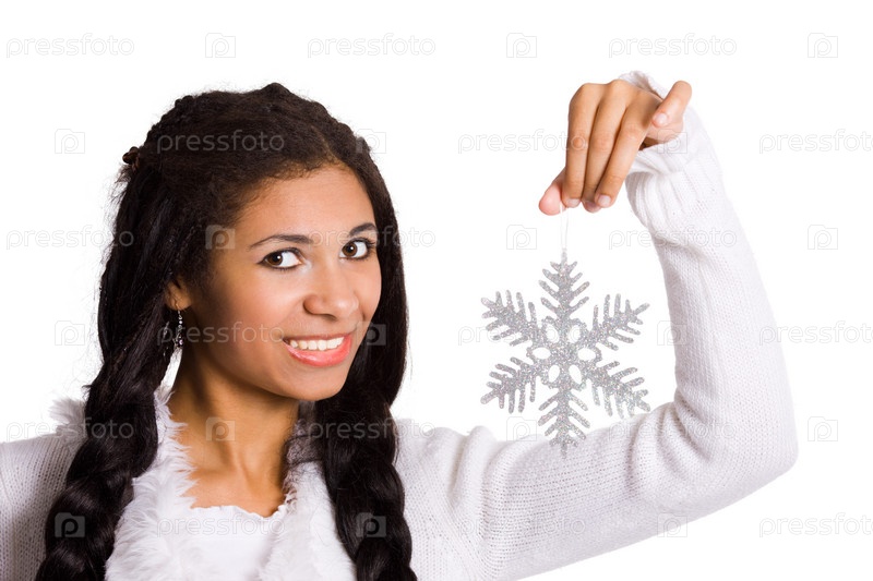 Молодая женщина держит в руке большую снежинку