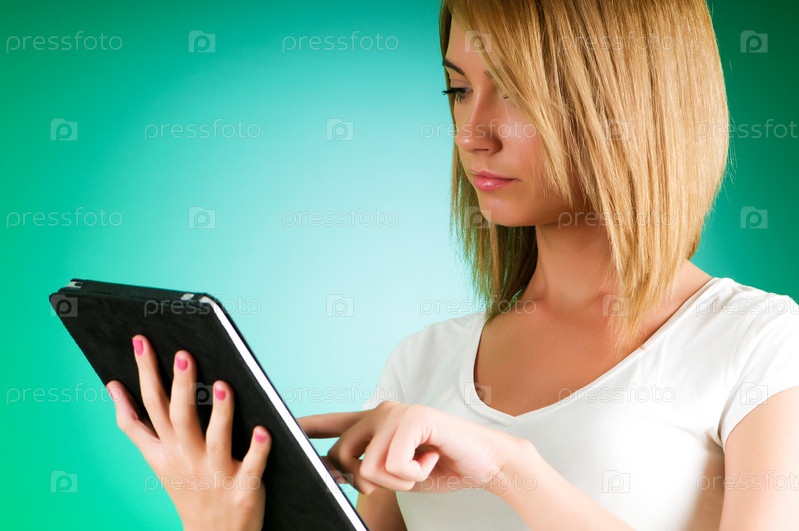 Девушка с портативным компьютером на зеленом фоне