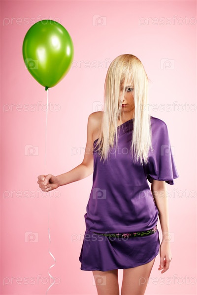 Красивая блондинка с воздушным шариком закрыла лицо волосами