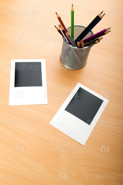 Две пустые фоторамки и стакан с цветными карандашами на деревянном полированном столе