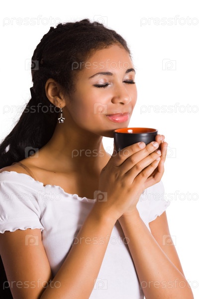 Красивая темнокожая молодая женщина с кофейной чашкой