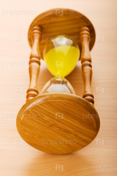 Песочные часы лежат на деревянном полированном столе