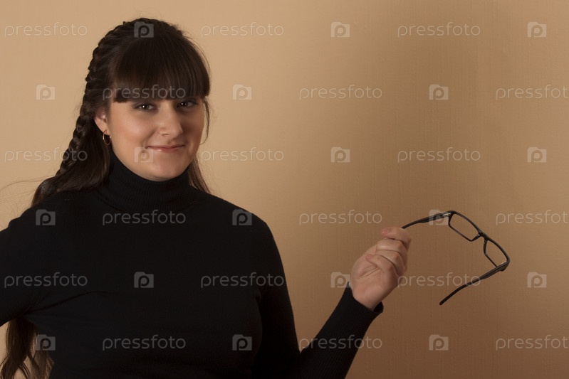 Портрет молодой брюнетки с очками в руке