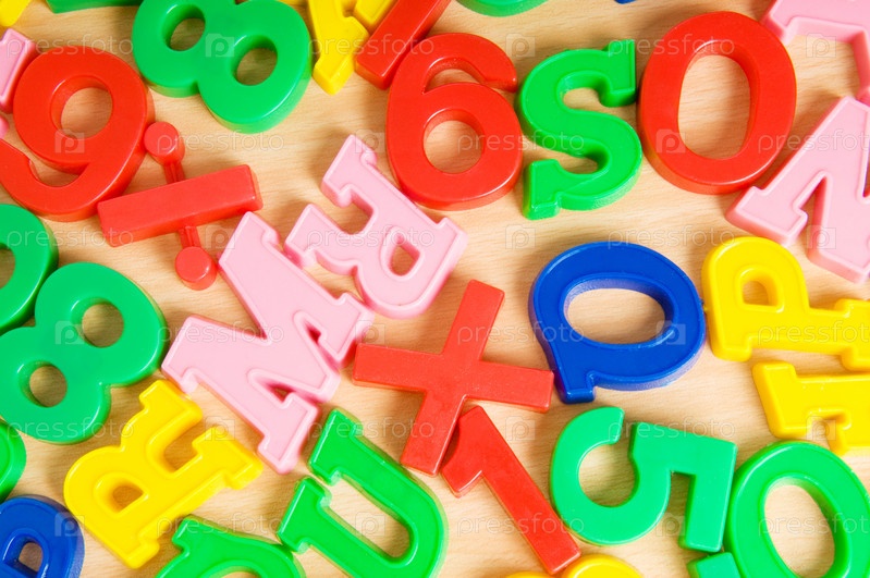 Детские буквы и цифры на деревянном полированном столе