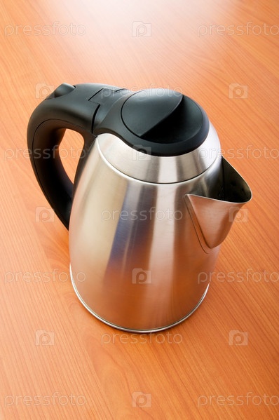 Металлический чайник на деревянном полированном столе