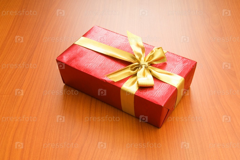 Красная подарочная коробка с золотой лентой на деревянном полированном столе