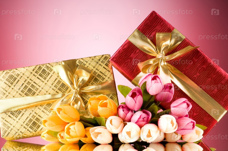 Две подарочные коробки и букет тюльпанов на розовом фоне